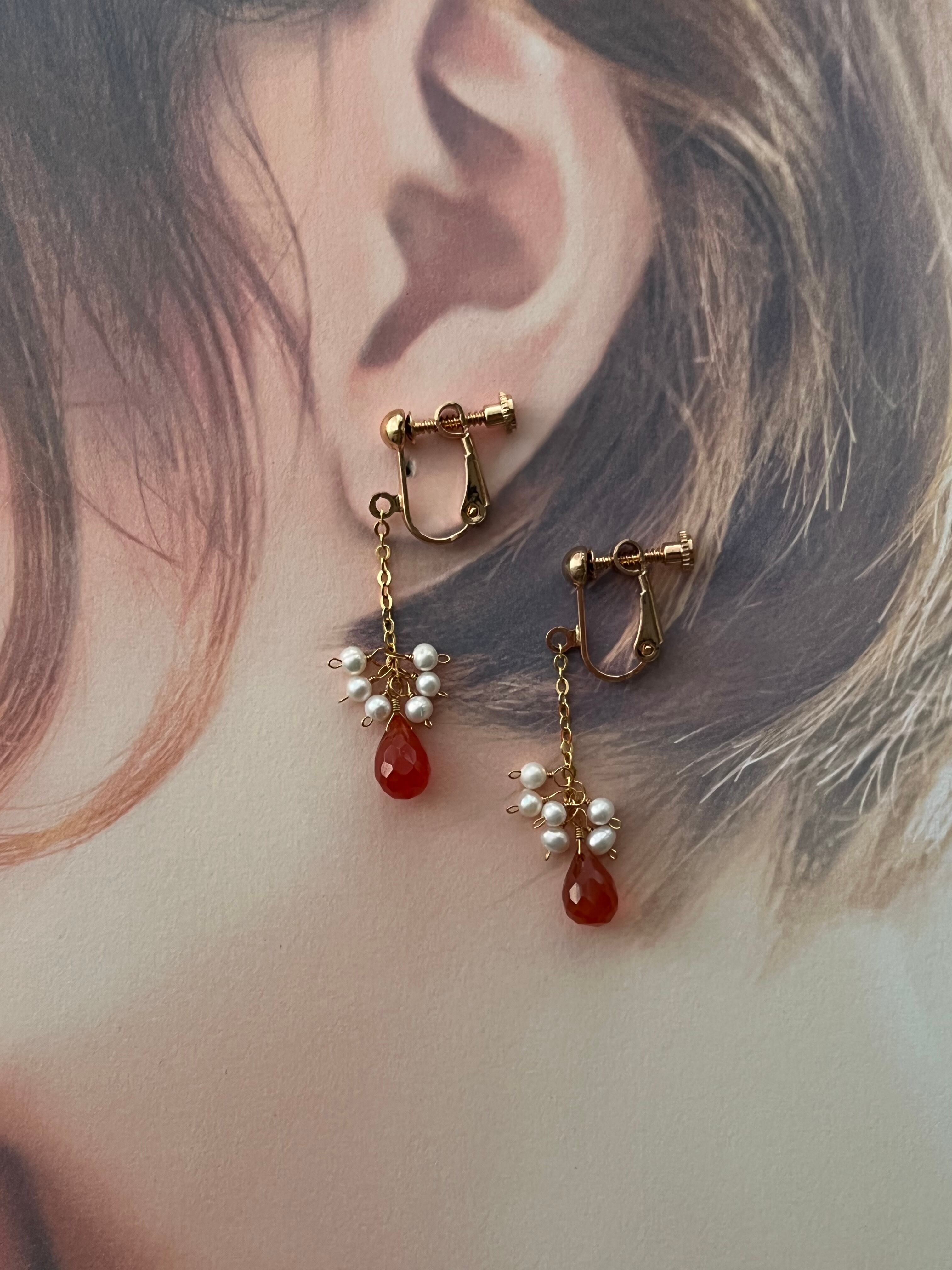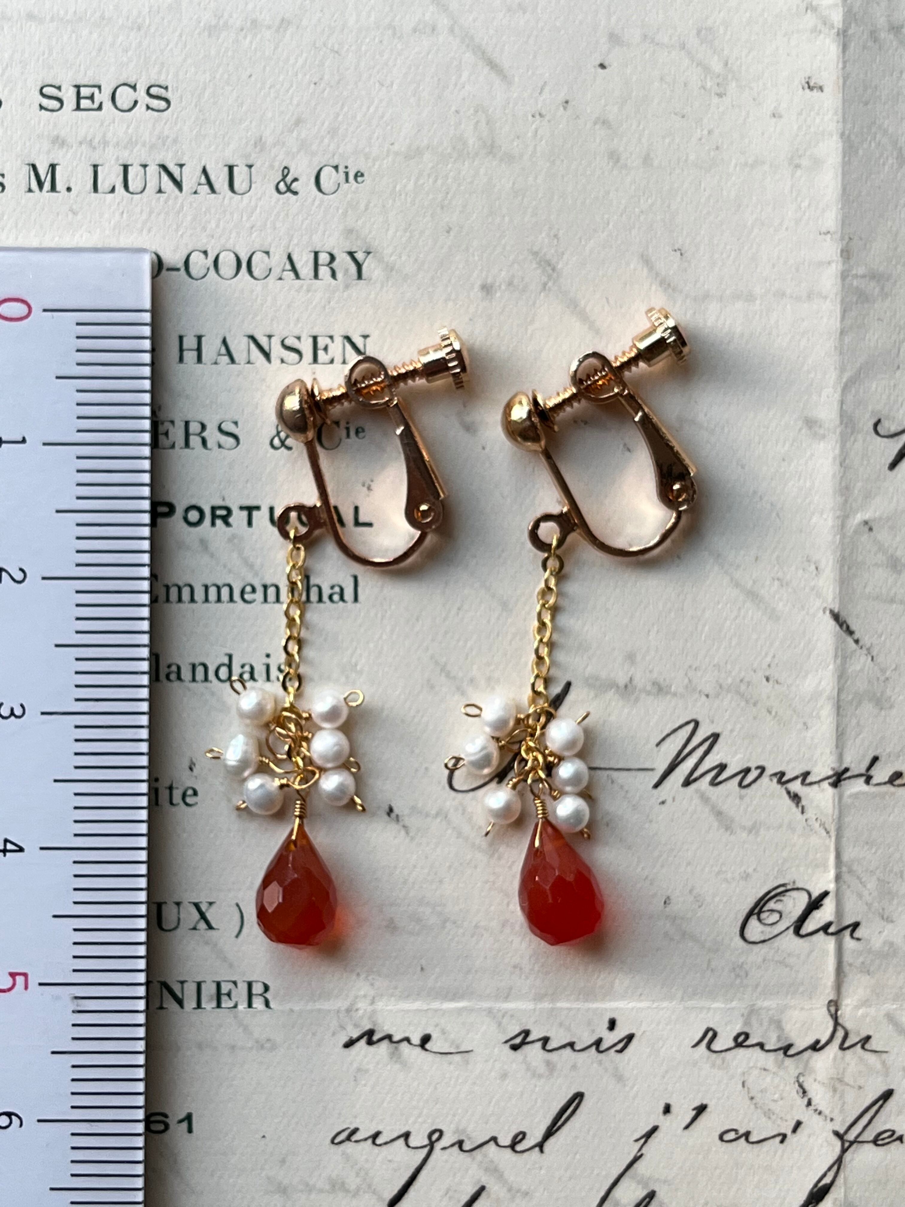 キャロットジュースのようなオレンジのカーネリアンと淡水パールのイヤリングです。
