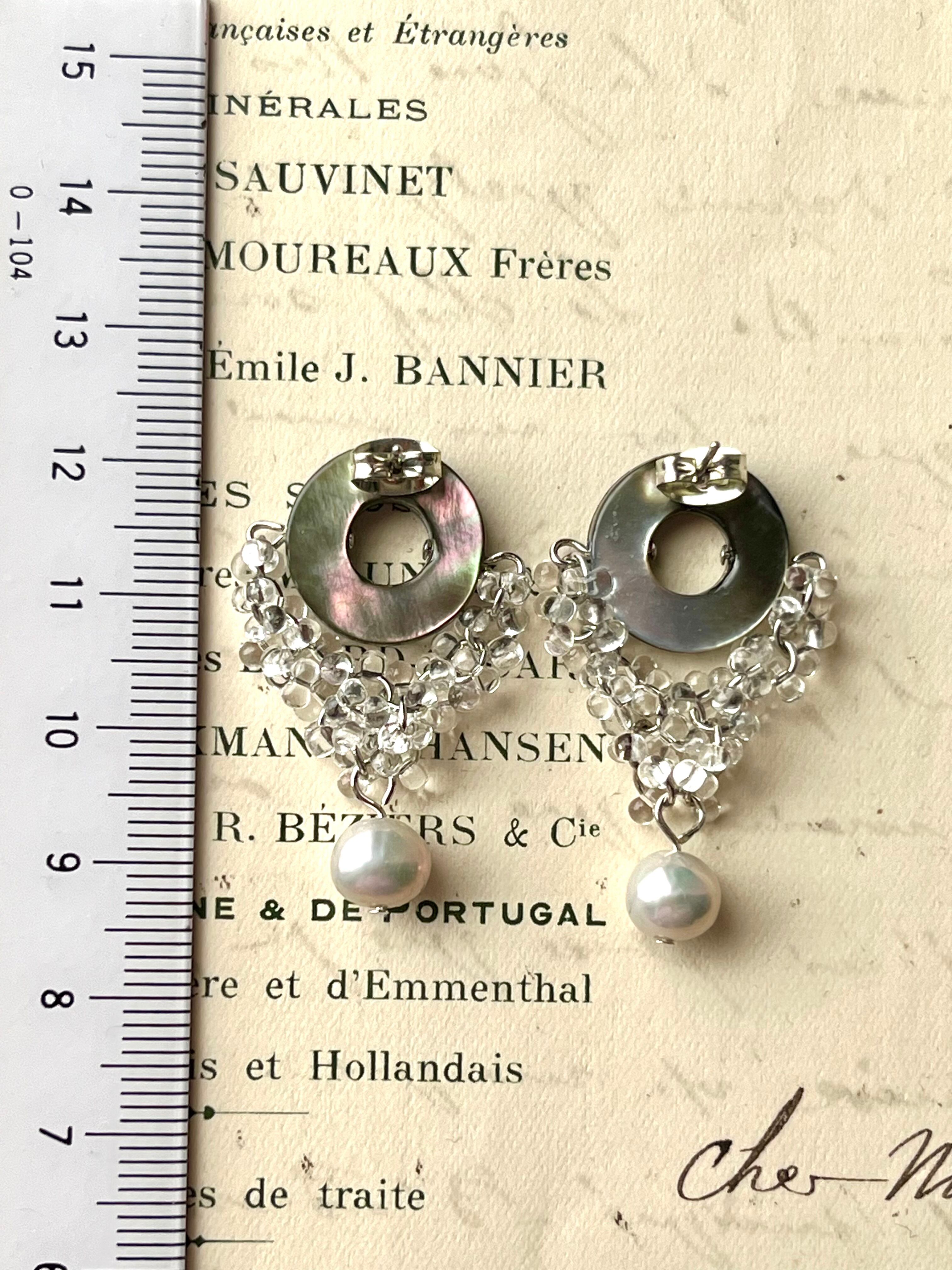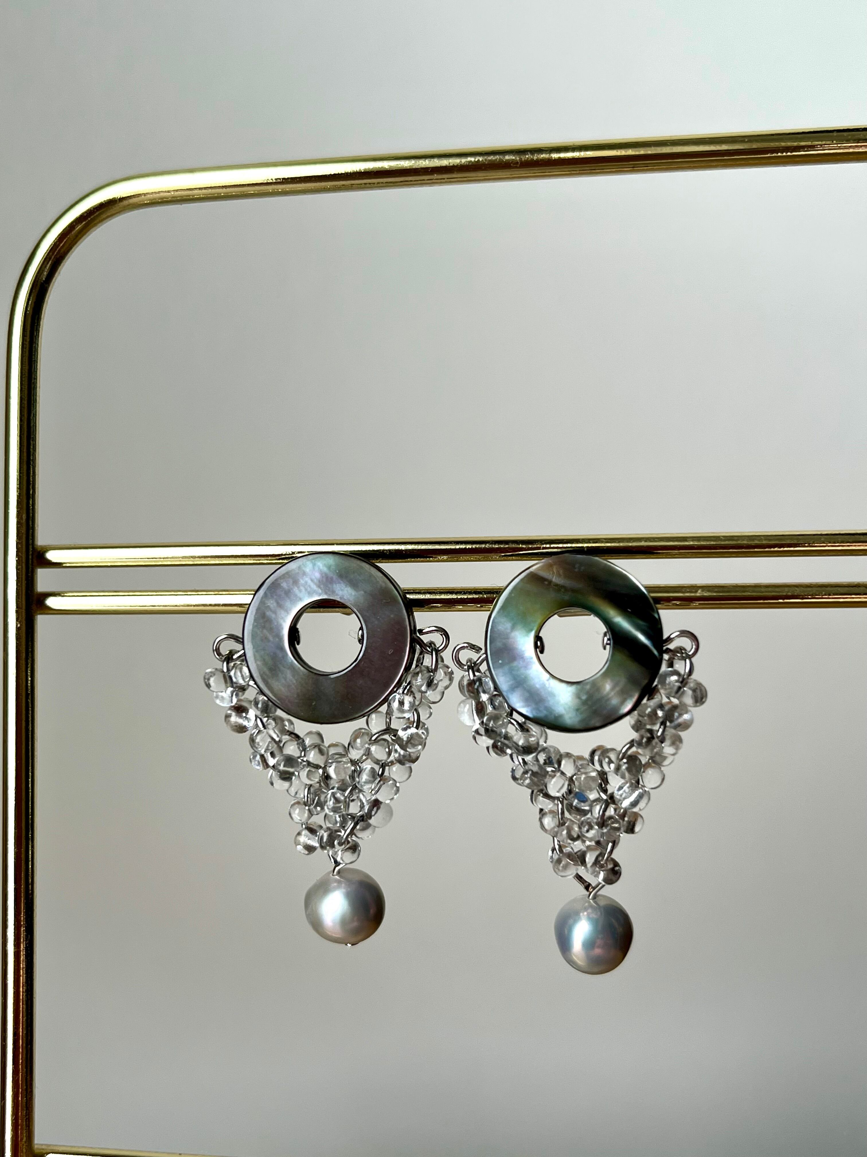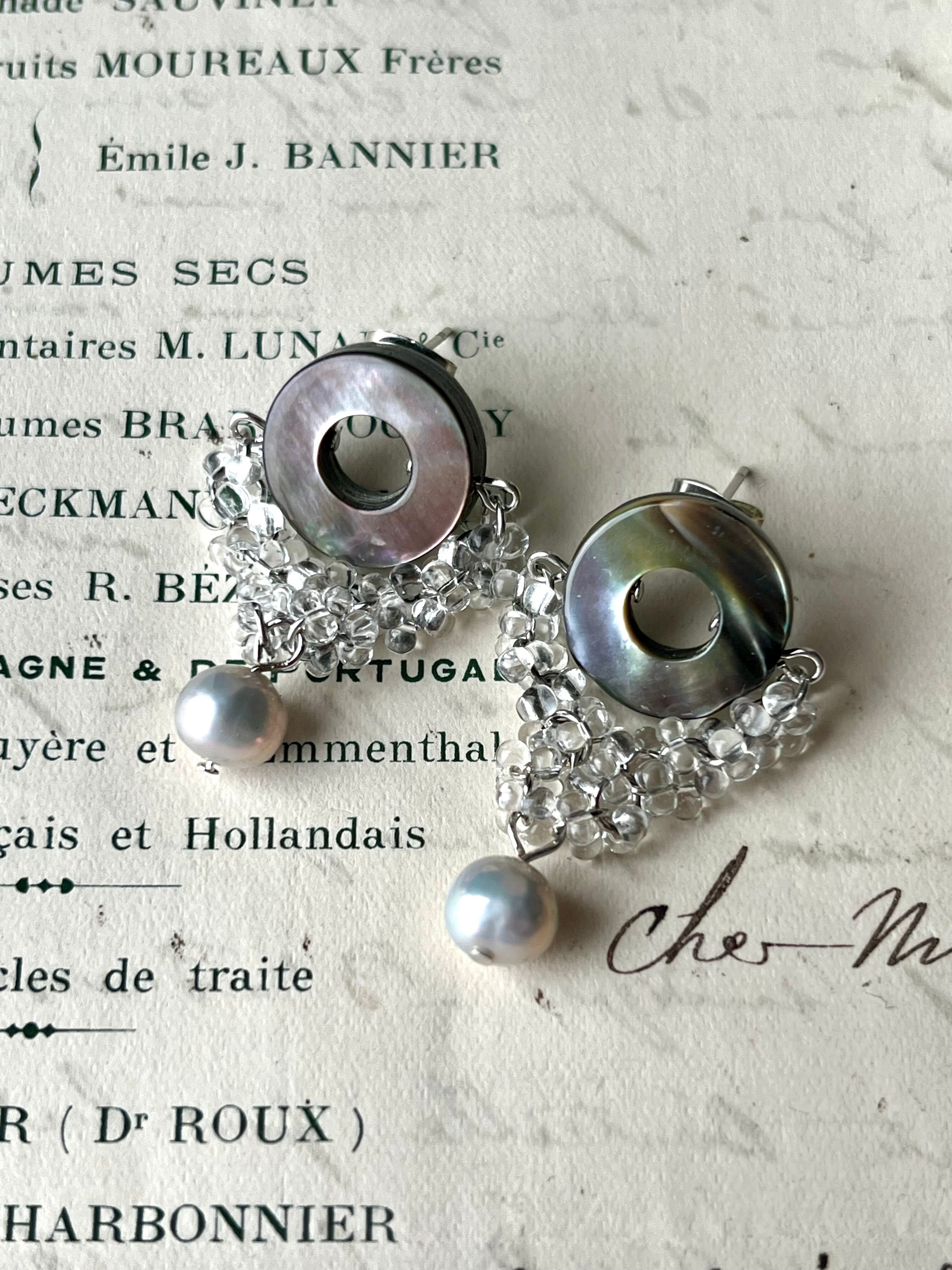 ガラス素材の約2mmのファルファーレビーズと照りが美しいグレーパールをあしらい、